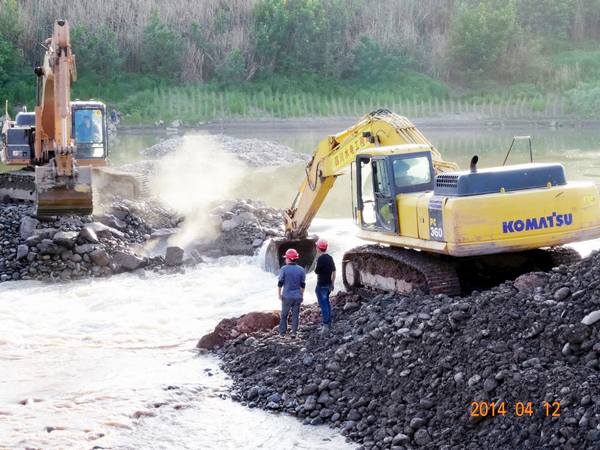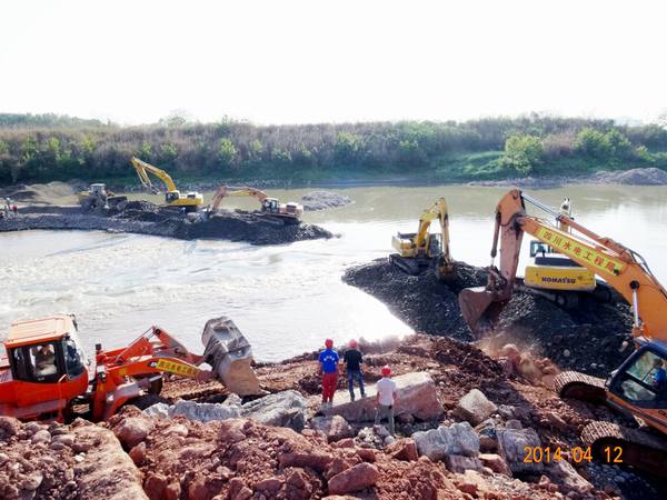 正午時(shí)分,整個(gè)工地機(jī)械轟鳴,6臺(tái)挖掘機(jī)、4臺(tái)裝載機(jī)、6輛20t自卸汽車往來穿梭,抓緊進(jìn)行圍堰填筑。隨著兩岸戧堤的逐步進(jìn)占,河道由寬變窄,最后形成一個(gè)寬約3米的龍口,往日平靜的涪江現(xiàn)在卻白浪翻滾,咆哮著奔出龍口。由于上游電站泄洪,導(dǎo)致河水水位陡增,用于截流的大塊石瞬間被沖出裹頭,最后3米的龍口始終無法合龍。面對(duì)前期準(zhǔn)備的截流材料用盡,現(xiàn)場(chǎng)附近又沒有大塊石材的急情,四處領(lǐng)導(dǎo)果斷采取措施,命令截流施工人員將鋼橋板投入江中用于擋水截流,挖掘機(jī)不斷地向橋板上游投入石料。至晚上8時(shí),二期圍堰終于順利合龍。