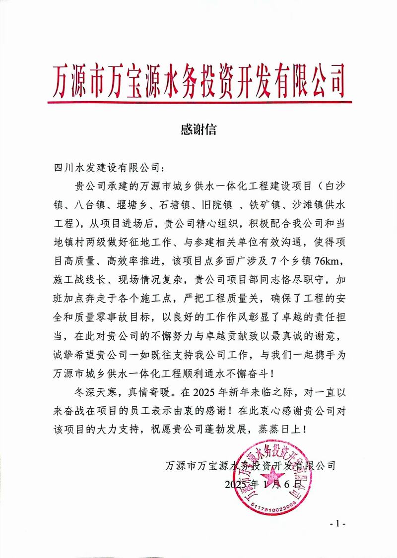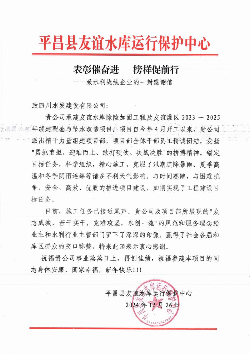 2024年,四分公司秉承“川水善建映初心”的初心使命,堅持“遵約守信、融合發展”的經營理念,積極履行企業責任擔當,用實際行動贏得了業主及相關單位的高度認可,收獲多封表揚信和感謝信。