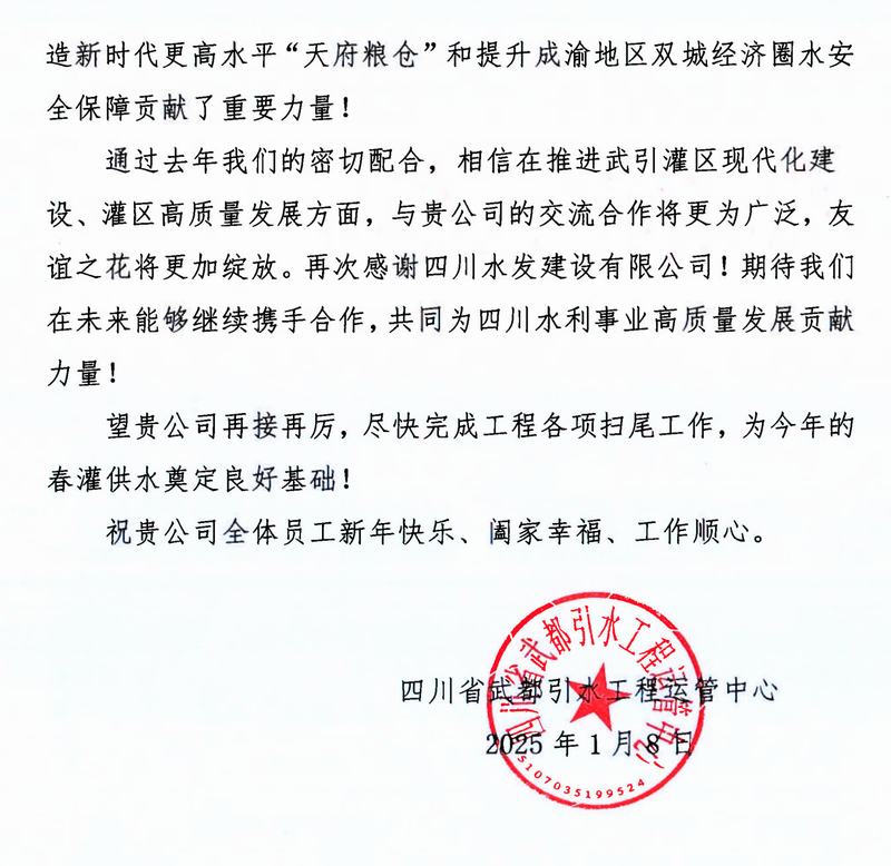 耕耘不輟,履踐致遠,這封表揚信,不僅是對項目部團隊精神、專業素養和項目成果的高度肯定,更是對公司整體實力的認可。新年新起點,武引項目部將再接再厲、接續奮斗,以更加昂揚的精神狀態、更加扎實的工作作風、更加有力的工作舉措投入到后續工作中,實干篤行、銳意進取,為今年的春灌供水奠定良好基礎、為打造新時代更高水平“天府糧倉”和提升成渝地區雙城經濟圈水安全保障貢獻水發力量。