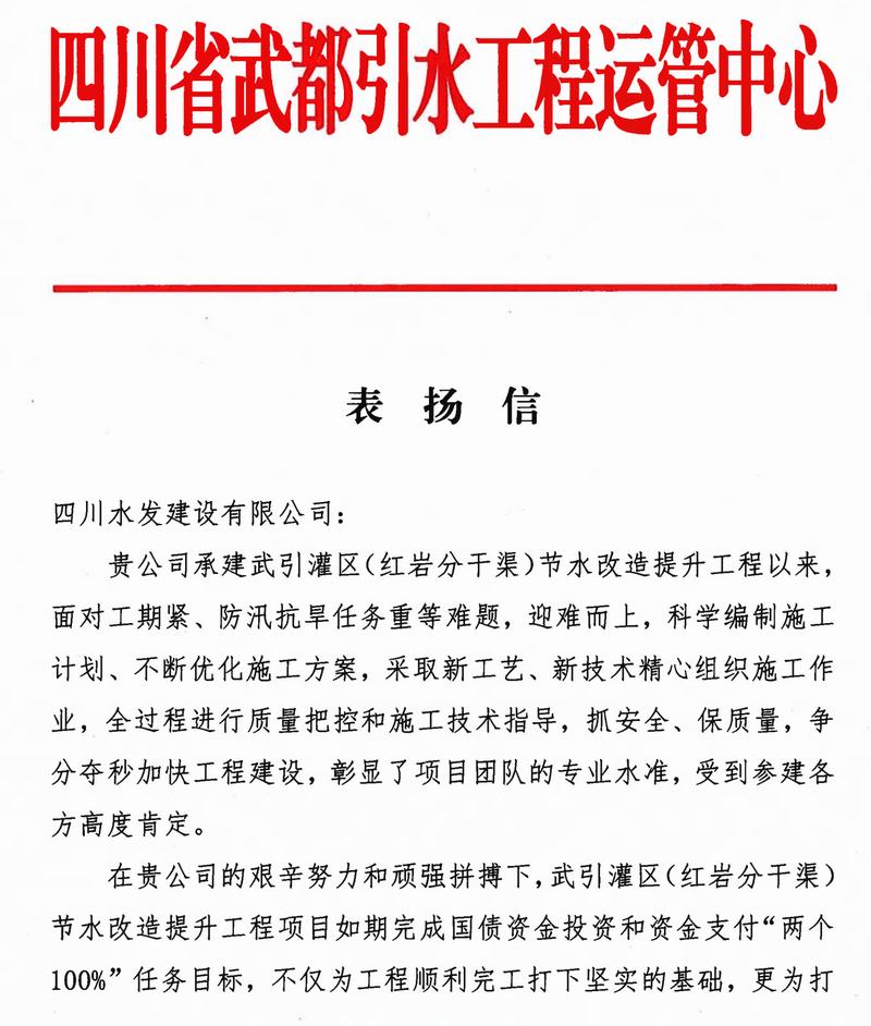 近日,公司收到四川省武都引水工程運營中心表揚信。信中對公司在武引項目承建期間憑借科學的統籌規劃與合理的資源調度,如期完成國債資金投資和資金支付“兩個100%”任務目標給予了高度評價;對三分公司武都引水灌區(紅巖分干渠)節水改造提升工程項目經理部全體干部職工以安全為前提、以質量求生存、以管理要效益、以創新促發展,勠力同心與時間賽跑、攻堅克難展鐵軍風采的出色表現給予高度肯定。