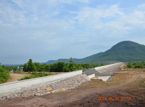 三枯期 (2013.10~2014.6) 擋水大壩主要完成了河床壩段約200m的壩基開挖、基礎處理、壩體填筑到設計高程,以及壩頂1800m防浪墻砼澆筑,目前正進行壩頂公路和壩后梯等收尾工作;引水渠分成3個工區,完成主渠3800m,三條支渠11974m,斗渠44條共26054m,渡槽3座以及分水閘、節制閘、交通橋涵等附屬建筑。