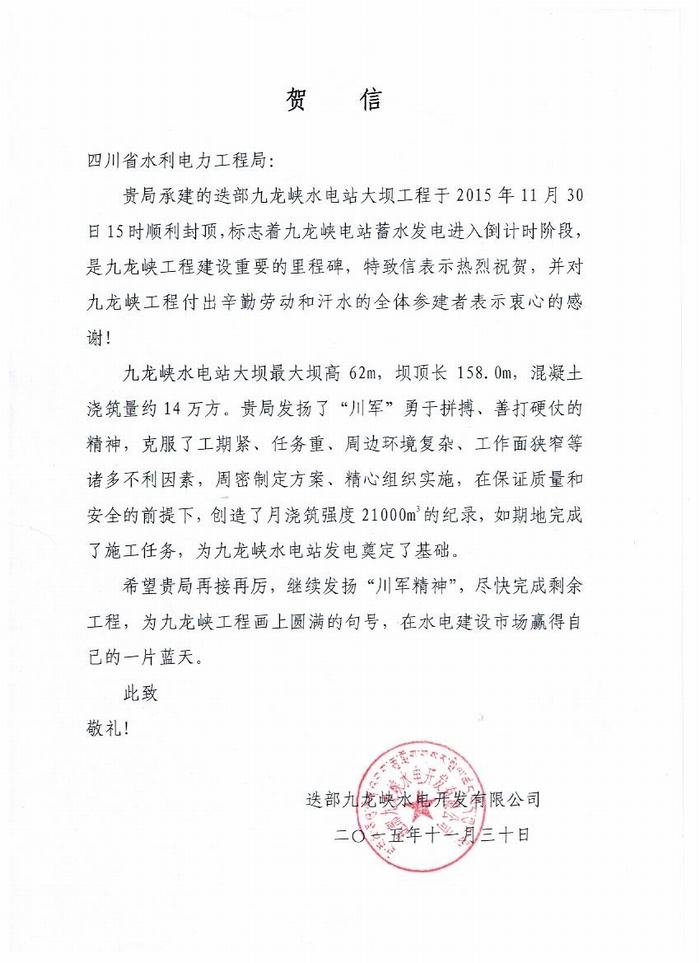 11月30日15時,九龍峽水電站大壩工程4#壩段2#梁吊裝完閉,標志著歷時3年艱辛建設的九龍峽水電站大壩工程已達到全線封頂目標。九龍峽水電站共有9個壩段,壩高62米,壩長158米,混凝土澆筑量約14萬方。